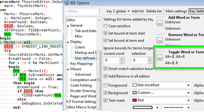 Track variables and identifiers in your code by temporarily highlighting them (on the stroke of a key), using the "user defined markup".